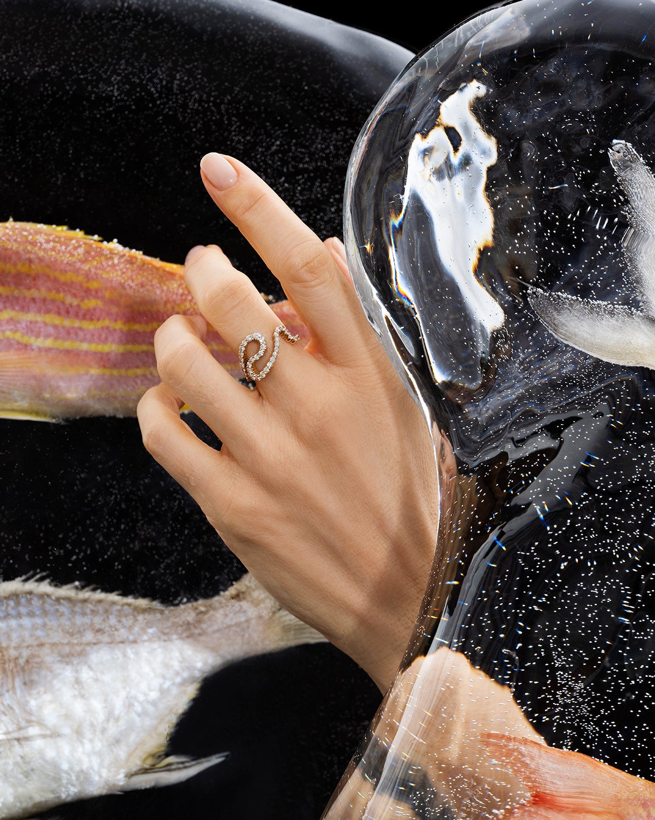 Taking inspiration from the way water moves, gemstones of the Level Collection appear to float and slide inside their asymmetrical heavy gold settings.