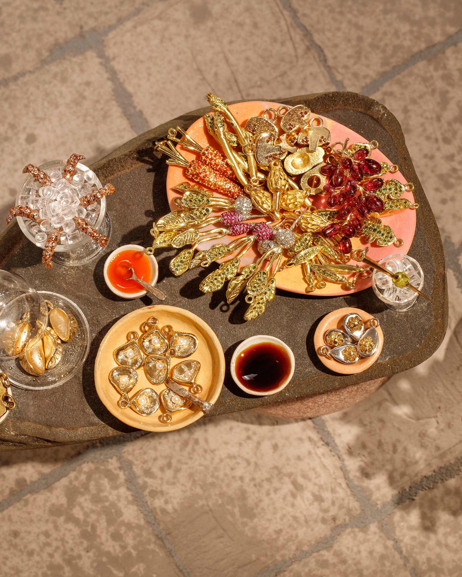 Locally harvested produce! Fresh baked loaves! Hot pizza! Table treats! Common provisions made with uncommon gemstones, Fine Foods is a body of work by Caitlin Mociun that challenges the ideology of modern fine jewelry — that it has to be serious, boring, or saved for special occasions — through an exploration of gastronomical miniatures. Comprised of wearable food charms from five distinct collections, each one offers a point of connection, evoking a shared memory or personal experience. One charm can take several months to produce from start to finish. Most designs begin with a mold handmade by Caitlin, and creation can include sourcing and carving stones, and high-end, time-consuming processes such as enameling and pavé.