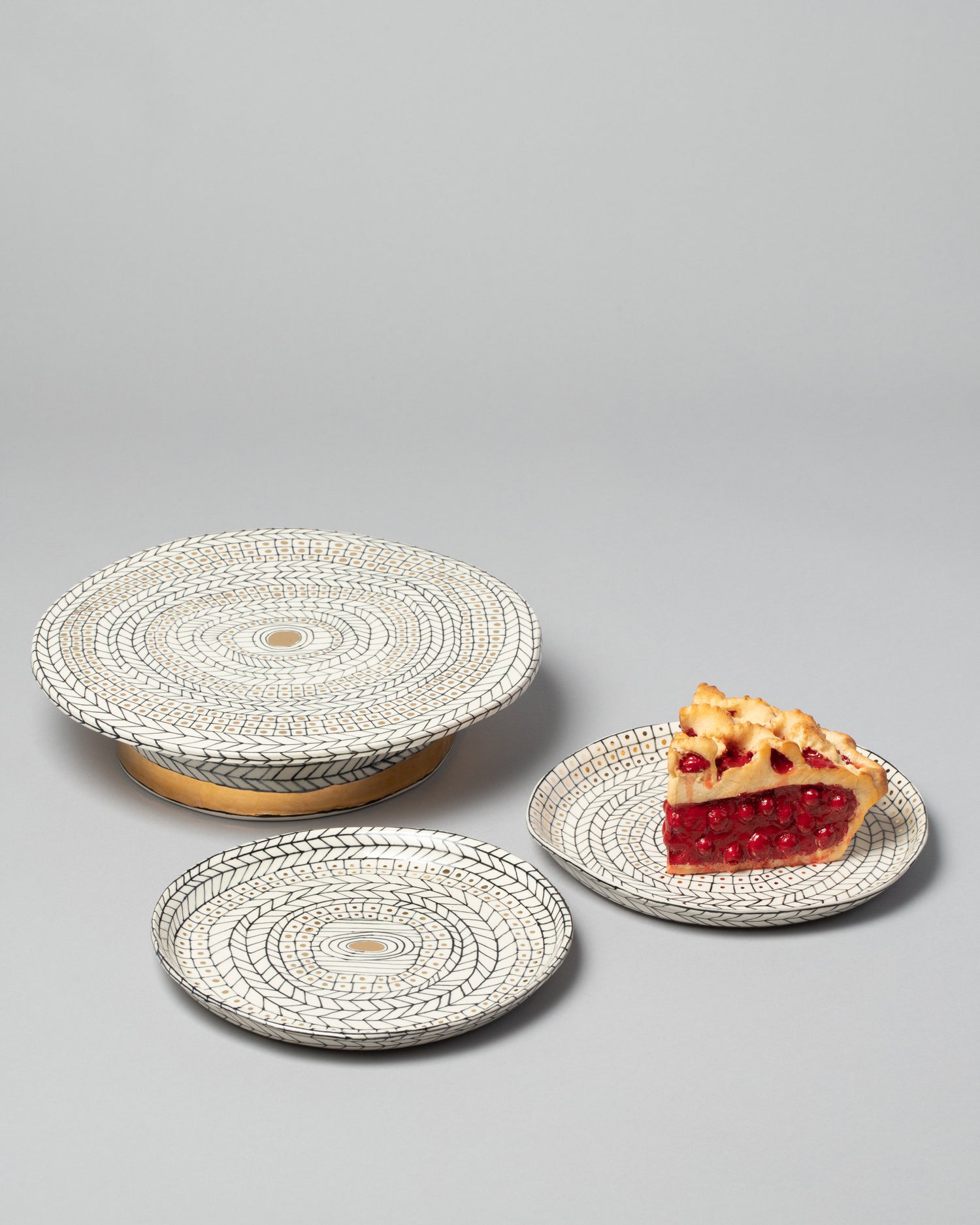 Suzanne Sullivan sculpts, with guidance from her intuition, to add extraordinary texture and striking pattern play to ordinary moments. Her one-of-a-kind, hand-built porcelain pieces feature gold leaf accents and are made in Philadelphia.