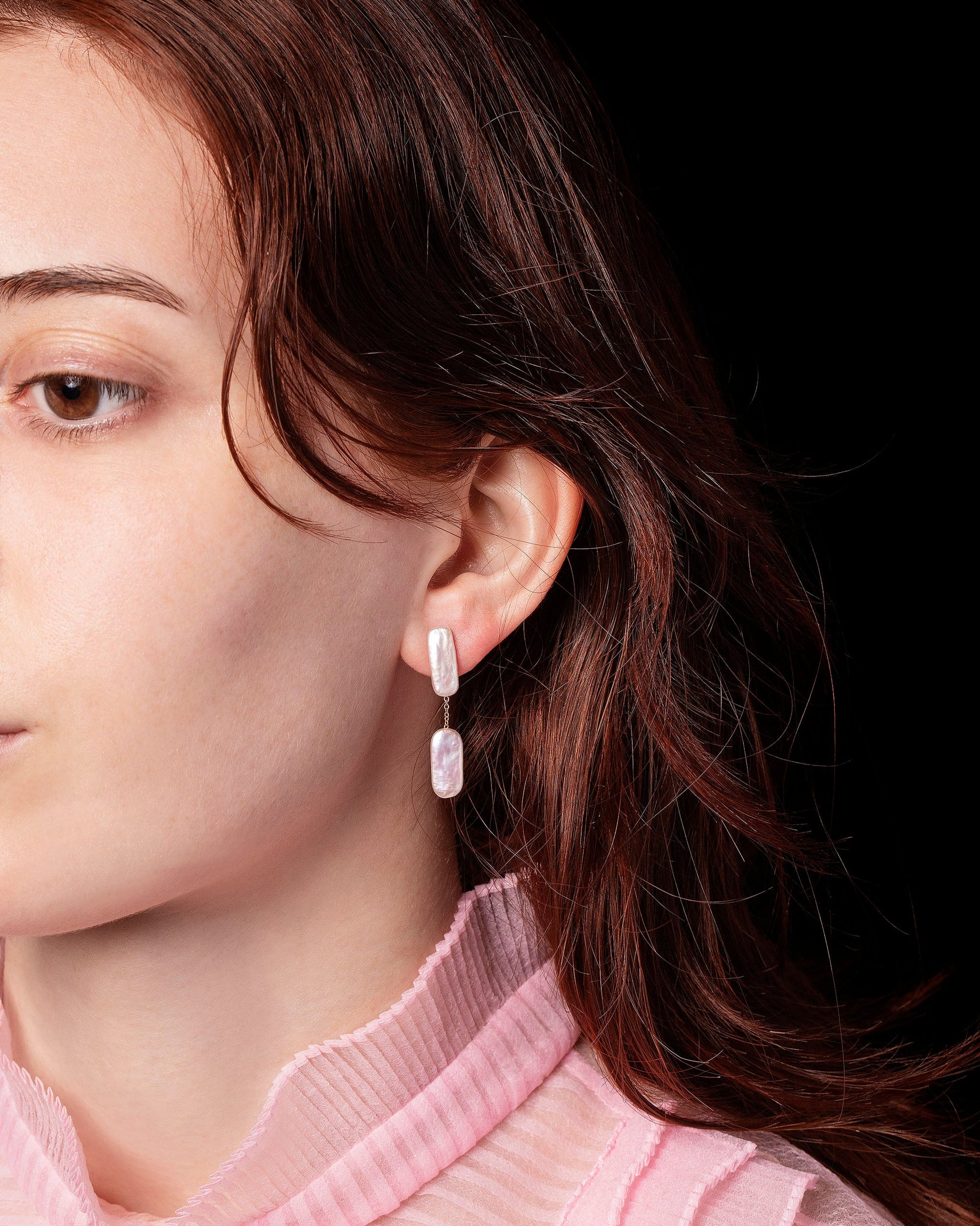 Four candy bar shaped, Tennessee River pearls are secured on posts and connected with chain
